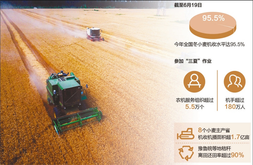 據(jù)農(nóng)業(yè)農(nóng)村部統(tǒng)計(jì),今年全國參加“三夏”作業(yè)的農(nóng)機(jī)服務(wù)組織預(yù)計(jì)超過5.5萬個(gè),機(jī)手超過180萬人,截至6月19日,全國冬小麥機(jī)收水平達(dá)到95.5%,8個(gè)小麥主產(chǎn)省機(jī)收、機(jī)播服務(wù)面積超過1.7億畝。全程機(jī)械化特點(diǎn)明顯,各地主推“一條龍”作業(yè),在搶收小麥的同時(shí),玉米機(jī)播隨即展開,夏收、夏種、夏管這“三夏”正在變成“兩夏”。