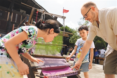 外國(guó)游客在湖南通道侗族自治縣體驗(yàn)侗錦制作。吳三東攝(人民圖片)