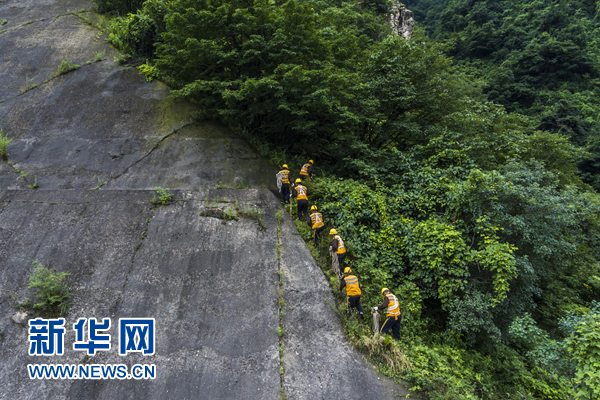 “蜘蛛俠”們穿過雜樹叢爬上陡坡準備作業(yè)。新華網 王頔攝
