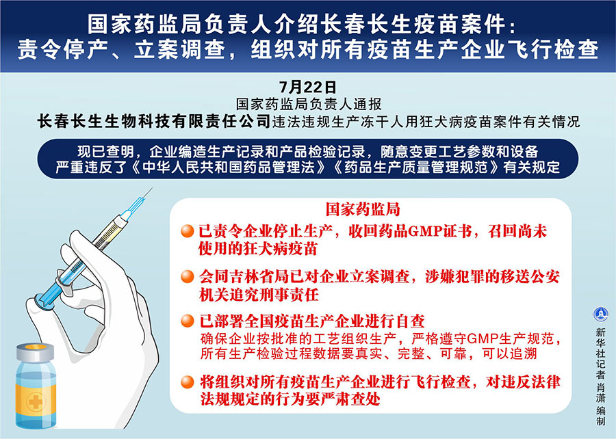 新華社北京7月22日電(記者齊中熙、趙文君)國(guó)家藥監(jiān)局負(fù)責(zé)人22日通報(bào)長(zhǎng)春長(zhǎng)生生物科技有限責(zé)任公司違法違規(guī)生產(chǎn)凍干人用狂犬病疫苗案件有關(guān)情況。這位負(fù)責(zé)人說(shuō),國(guó)家藥監(jiān)局已責(zé)令企業(yè)停止生產(chǎn),收回藥品GMP證書,同時(shí)會(huì)同吉林省局已對(duì)企業(yè)立案調(diào)查,涉嫌犯罪的移送公安機(jī)關(guān)追究刑事責(zé)任。國(guó)家藥監(jiān)局將組織對(duì)所有疫苗生產(chǎn)企業(yè)進(jìn)行飛行檢查,對(duì)違反法律法規(guī)規(guī)定的行為要嚴(yán)肅查處。