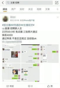 各大直播平臺(tái)上土豪也非常多,動(dòng)不動(dòng)就幾萬幾十萬地打賞。這些給了愛美且渴望鮮花和掌聲的女孩子一夜爆紅的不切實(shí)際的幻想。打開任意一個(gè)社交軟件,搜索“主播招聘”會(huì)立刻彈出上萬條信息,其中不乏“月入上萬不是夢(mèng)”“管吃管住,不是巨丑就過”這樣極具吸引力的條件。