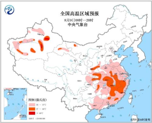 據(jù)中央氣象臺(tái)網(wǎng)站消息,中央氣象臺(tái)8月9日06時(shí)繼續(xù)發(fā)布高溫黃色預(yù)警:預(yù)計(jì)8月9日白天,陜西中南部、黃淮大部、江淮、江漢、四川盆地東北部、江南大部、華南中東部、甘肅西部及新疆南疆盆地和沿天山一帶等地的最高氣溫有35~36℃。