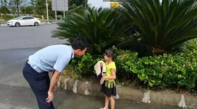 公路上車來(lái)車往,5歲的小女孩獨(dú)自行走在路邊。8月13日一大早,溫州市永嘉縣楓林派出所的民警戴柏清就遇到了這樣的一幕。