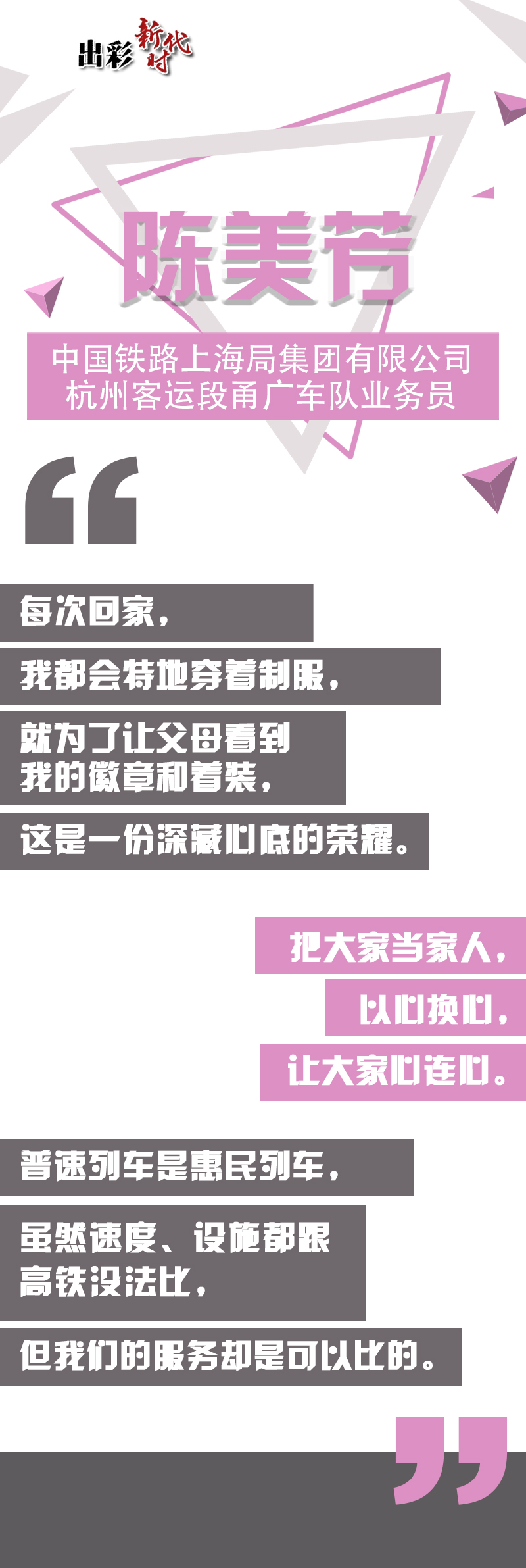 陳美芳是杭州客運段甬廣車隊的業(yè)務(wù)員,曾做過10年列車長的她,把一件件不起眼的小事辦成了大事,把普速列車變成了惠民列車。多年來,她把乘客遇到的不便和小事記在小本上,解決這些“小事”,就是她心中“比什么都重要”的大事。乘客說:“這車慢,但慢有慢的人情味,慢有慢的風景?!?