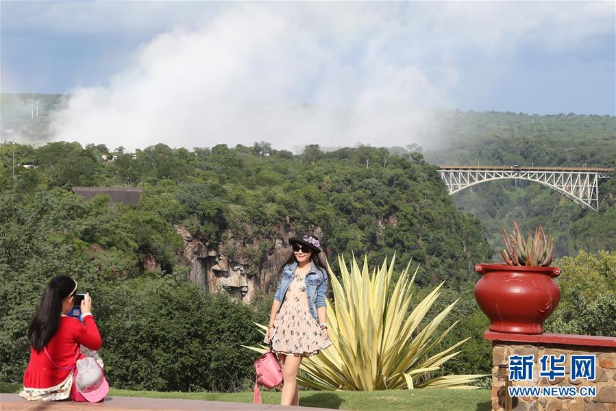 2017年1月27日,在津巴布韋維多利亞瀑布城,來自中國的一對母女以遠處的贊比西鐵橋為背景拍照留念。近年來,春節(jié)假期期間前往非洲旅游的中國游客逐漸增多。? 新華社發(fā)(費列蒙攝)