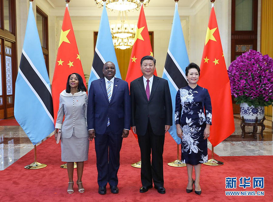 8月31日,國(guó)家主席習(xí)近平在北京人民大會(huì)堂同博茨瓦納總統(tǒng)馬西西舉行會(huì)談。這是習(xí)近平和夫人彭麗媛同馬西西夫婦合影。 新華社記者 鞠鵬 攝