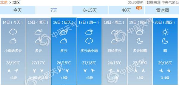 今天京城大部有小雨,北京市氣象臺預計,今天白天陰大部地區(qū)有小雨或零星小雨轉(zhuǎn)多云,早晨有輕霧或霧,北轉(zhuǎn)南風二三級,最高氣溫28℃;夜間多云轉(zhuǎn)陰,北部山區(qū)有小雨,南風二級轉(zhuǎn)北風三四級,最低氣溫19℃。