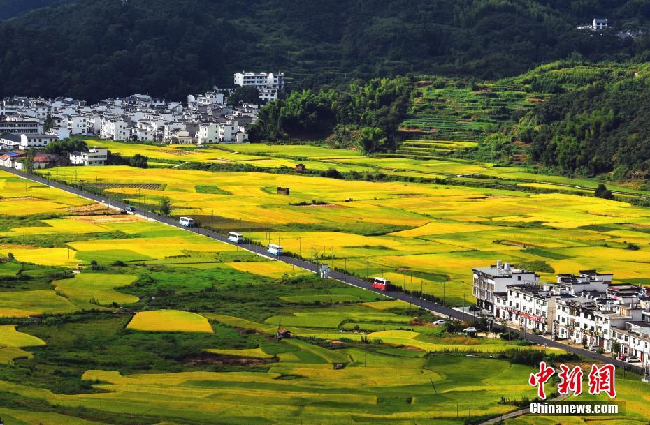 9月13日,在“中國最美鄉(xiāng)村”的江西婺源縣,正值收獲期的金黃水稻與周邊建筑構成了一幅美好的田園豐收圖卷。中新社發(fā) 曹加祥 攝
