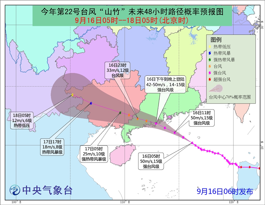 今年第22號臺風“山竹”(強臺風級)將以每小時30公里左右的速度向西偏北方向移動,將于16日下午到晚上在廣東珠海到吳川一帶沿海登陸(14~15級,42~50米/秒,強臺風級),登陸后將繼續(xù)向西偏北方向移動,強度逐漸減弱。中央氣象臺9月16日06時繼續(xù)發(fā)布臺風紅色預警。預計16日08時至17日08時,南海中北部、臺灣海峽、巴士海峽、瓊州海峽、北部灣、福建沿海、廣東沿海及廣東中南部、珠江口、香港、澳門、海南島東部和北部沿海、廣西東部及沿海將有7~10級大風,陣風11~12級;其中南海北部、廣東大部沿海、珠江口、香港、澳門將有11~13級大風,陣風14~15級,“山竹”中心經(jīng)過的附近海面或地區(qū)風力可達14~15級,陣風16~17級。