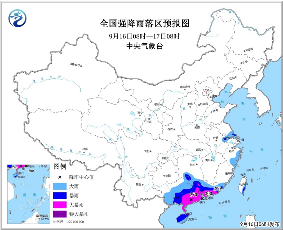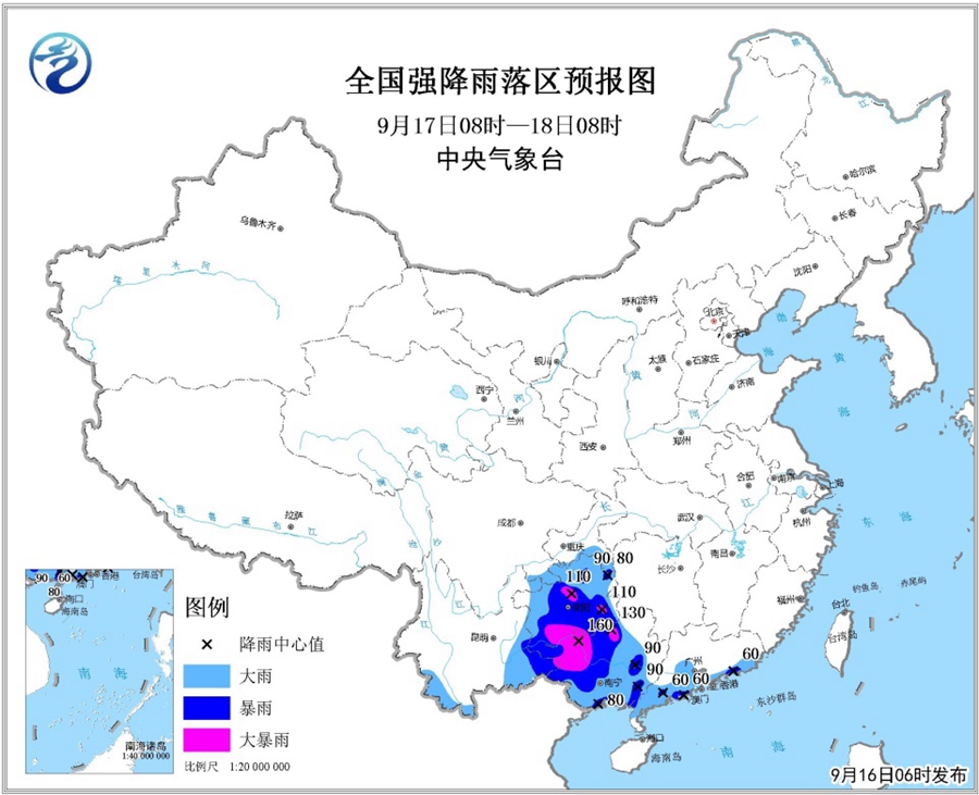 受臺風“山竹”影響,預計9月16日至18日,華南大部、貴州、云南東部和南部等地將有大到暴雨,其中廣東中南部、香港、澳門、廣西西部和中南部、海南島北部、貴州中南部、云南東南部和西南部等地的部分地區(qū)有大暴雨,局地有特大暴雨,上述地區(qū)過程降水量100~200毫米,局地可達250~400毫米,最大小時雨強可達40~60毫米,局地可超過80毫米。中央氣象臺9月16日06時繼續(xù)發(fā)布暴雨橙色預警。