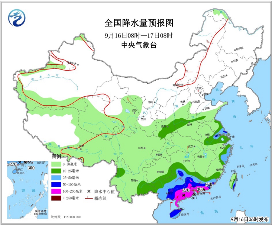 圖2 全國降水量預報圖(9月16日08時-17日08時)