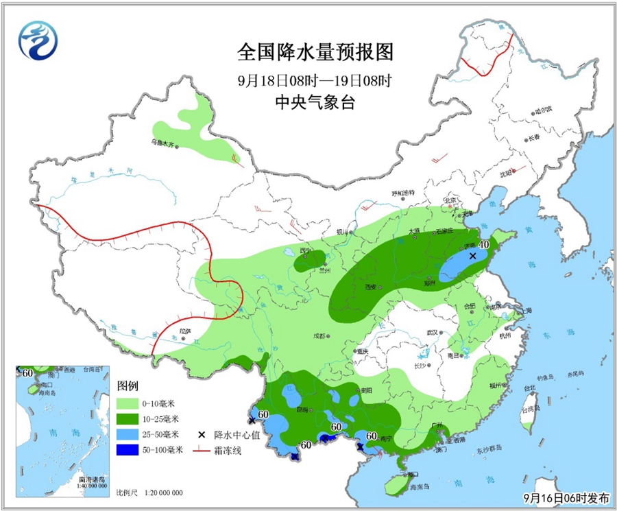 9月18日08時至19日08時,新疆東北部、西藏東部、西北地區(qū)大部、華北大部、黃淮、江淮大部、江南南部、西南地區(qū)和華南等地的部分地區(qū)有小到中雨,其中,山東中南部、貴州西南部、云南東部和西南部、廣西西南部等地的部分地區(qū)有大雨,局地暴雨(50~60毫米)(見圖6)。臺灣海峽、巴士海峽、南海東北部和中東部海域?qū)⒂?~6級、陣風7級的東北風或偏東風,南海西北部和中西部海域、北部灣將有4~6級東南風,南海西南部海域?qū)⒂?~6級西南風。