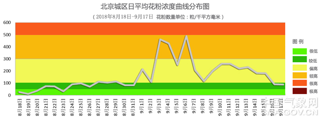 圖為北京城區(qū)近一個(gè)月日平均花粉濃度分布曲線。可以看到北京城區(qū)花粉濃度8月下旬一直處于較低水平,9月開始空氣中花粉濃度明顯升高,9月6日一度達(dá)到497粒/千平方毫米,9月16日開始,花粉濃度降到了較低水平。其中9月2日北京市出現(xiàn)了中雨天氣,從圖中也可以看出,市區(qū)花粉濃度出現(xiàn)了明顯下降。王美麗 制圖