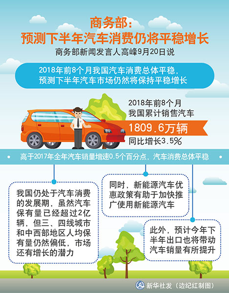 新華社北京9月20日電(初杭、陳煒偉)商務(wù)部新聞發(fā)言人高峰20日說,今年前8個月我國汽車消費總體平穩(wěn),預測下半年汽車市場仍然將保持平穩(wěn)增長。