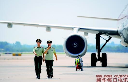 2018年8月7日,在南京祿口國(guó)際機(jī)場(chǎng)停機(jī)坪,王志國(guó)(右)進(jìn)行例行巡查。