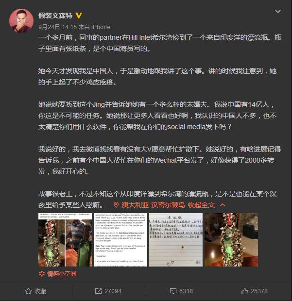 9月24日,知名旅游博主“假裝文森特”在微博發(fā)文稱,同事的伴侶凱特在澳大利亞的白天堂沙灘希爾灣撿到了一個(gè)來(lái)自印度洋的漂流瓶,瓶子里面有張紙條,是個(gè)中國(guó)船員寫(xiě)的。信里道出了對(duì)未婚妻的無(wú)盡思念:“我是一名海員,現(xiàn)在正在印度洋上正在航行,心里很思念家中的未婚妻,剛訂婚不久我就出海了,心里感覺(jué)很對(duì)不起她,借著漂流瓶把心中的話寫(xiě)出來(lái)。希望我回去以后,能跟晨靜和和美美,長(zhǎng)長(zhǎng)久久,其實(shí)呢,瓶子在深海中,也不奢侈有人能撿到打開(kāi),只是求一個(gè)心里的安慰?!币虼?,凱特非常希望能找到信中提到的未婚妻晨靜,告訴她她有一個(gè)多么棒的未婚夫。