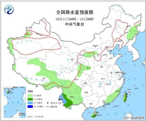 10月11日08時至12日08時,黑龍江東南部、吉林東部、新疆西部、西藏北部和東部等地有小到中雨(雪)或雨夾雪;西北地區(qū)東部、四川南部、云南大部、貴州西部、華南東部、海南島和臺灣島等地部分地區(qū)有小到中雨,其中,云南西部、海南島南部、臺灣東北部等地局地有大雨或暴雨(50~70毫米)。內(nèi)蒙古中部、遼東半島、山東半島等地部分地區(qū)有4~6級風。臺灣海峽將有7~8級、陣風9級的東北風。