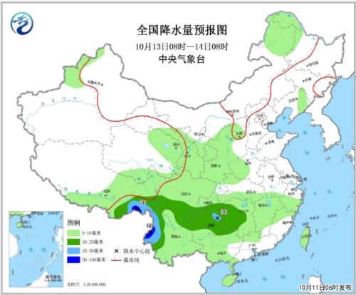 10月12日08時至13日08時,青藏高原東部等地有小雨(雪)或雨夾雪;甘肅東部、陜西北部、山西中北部、西南地區(qū)大部、廣西西部、臺灣島和海南島等地部分地區(qū)有小到中雨,其中,西藏東南部和云南西部等地局地有大雨或暴雨(50~80毫米)。臺灣海峽將有7~8級、陣風9級減弱為6~7級、陣風8級的東北風。