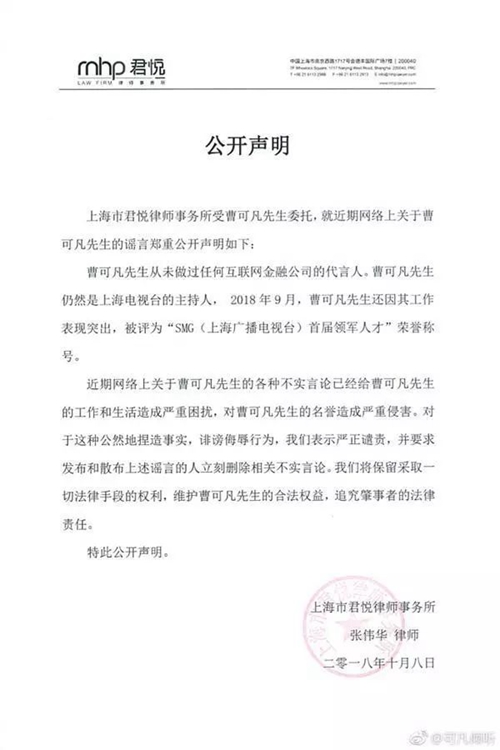 但事實(shí)上,主持人曹可凡國(guó)慶節(jié)前后多次參加公眾活動(dòng),國(guó)慶期間也曾發(fā)布過(guò)微博。但這些都沒(méi)能有效阻止謠言傳播,最終還是靠曹可凡本人委托的一封律師函,方才真相大白。