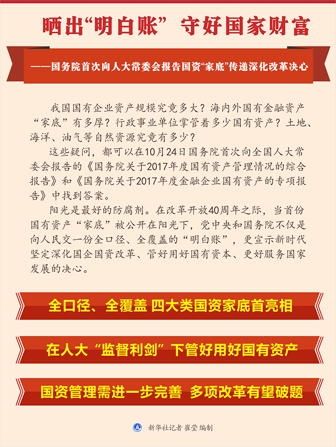 ?。玻慈?,國(guó)務(wù)院向全國(guó)人大常委會(huì)首次報(bào)告了國(guó)有資產(chǎn)管理情況,這份全口徑的國(guó)有資產(chǎn)綜合報(bào)告彰顯公開決心: