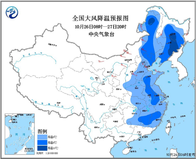 圖為全國大風(fēng)降溫預(yù)報圖(26日08時-27日20時)