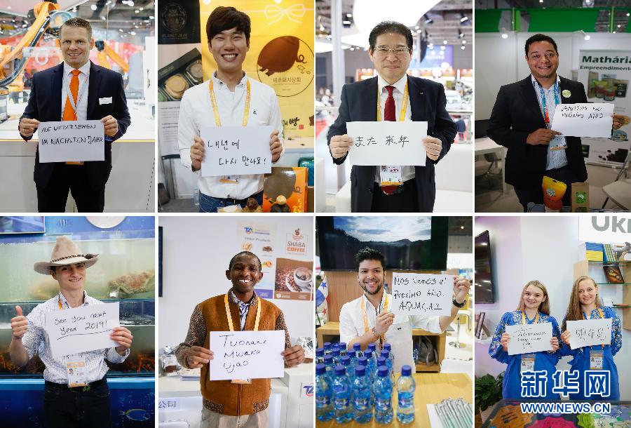 11月10日,進博會上不同國家的參展人員展示用不同語言書寫的“明年見”(拼版照片)。 首屆中國國際進口博覽會11月5日至10日在上海舉行。記者在采訪中了解到,很多參展商在進博會上收獲了不少訂單,宣傳了自己的產品,結識了很多朋友。他們表示,希望明年再來進博會。 新華社記者 侯東濤 攝
