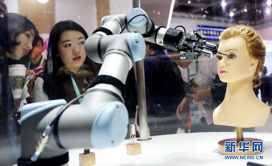 11月7日,參觀者在法國歐萊雅展臺觀看機器人作業(yè)演示。 休戚與共的地球村,共享創(chuàng)新成果已成為國際社會的共同意愿和現(xiàn)實選擇。透過進博會這個窗口可以看出,從上下游產業(yè)銜接到前沿領域合作,從協(xié)作共享資源到開放共享智慧,全球經(jīng)濟發(fā)展的新動能正在匯聚。 新華社記者 方喆 攝