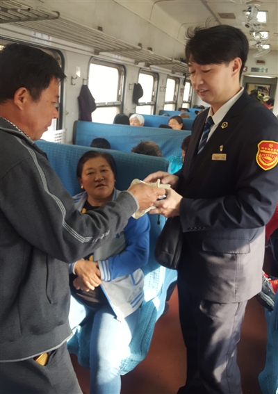 目前,除了四個(gè)大站提供售票服務(wù)外,7053次經(jīng)過(guò)的其他20個(gè)小站都是上車(chē)補(bǔ)票。圖為列車(chē)員正在為乘客補(bǔ)票。