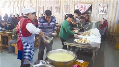 午飯時(shí)間,中郝峪村村民到大食堂免費(fèi)就餐。