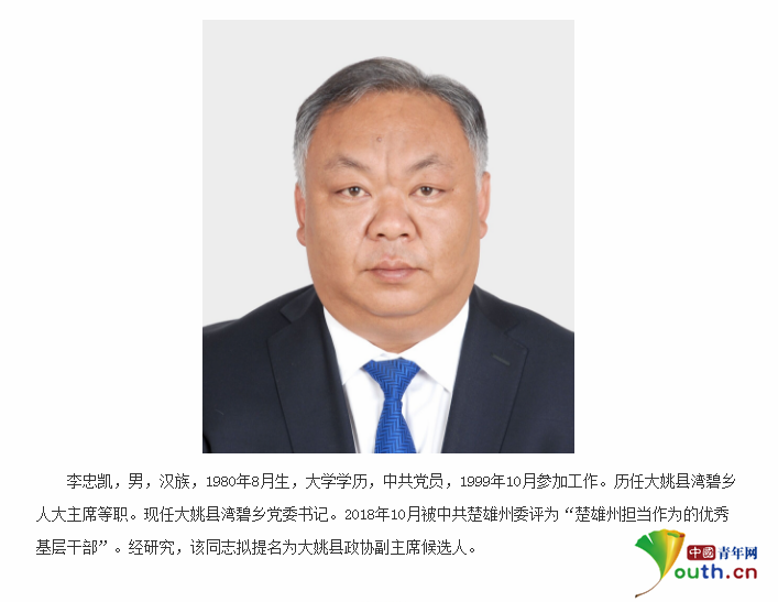 公示稱,李忠凱大學學歷,中共黨員,1999年10月參加工作。歷任大姚縣灣碧鄉(xiāng)人大主席等職。2018年10月被中共楚雄州委評為“楚雄州擔當作為的優(yōu)秀基層干部”。