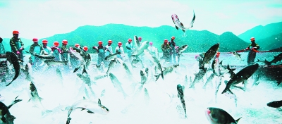 企業(yè)與地方聯(lián)合發(fā)展生態(tài)綠色經(jīng)濟,在千島湖創(chuàng)新發(fā)展“保水漁業(yè)”,使當?shù)氐木G水青山變成了金山銀山。圖為千島湖巨網(wǎng)捕魚的壯觀景象。(資料圖片)