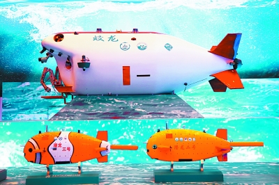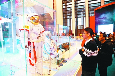 “可上九天攬月,可下五洋捉鱉”。一邊是航天技術(shù)展區(qū),一邊是航海技術(shù)展區(qū),完美對應著詩句,一上一下,延展著人類對于世界的認知和想象。天宮二號空間實驗室、嫦娥三號月球探測器以及蛟龍、海龍、潛龍“三龍兄弟”深海探測裝備模型,讓很多在場的孩子發(fā)出贊嘆之聲。