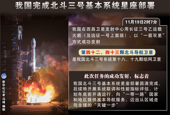 新華社西昌11月19日電(李國利、楊欣、樊永強)隨著兩顆全球組網衛(wèi)星19日凌晨從西昌衛(wèi)星發(fā)射中心順利升空,我國成功完成北斗三號基本系統(tǒng)星座部署。