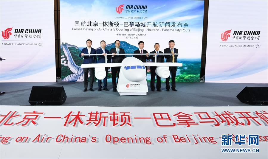 2018年3月22日,嘉賓在北京為北京—休斯頓—巴拿馬城航線(xiàn)開(kāi)通揭幕。中國(guó)國(guó)際航空公司于4月5日開(kāi)通此條新航線(xiàn)。新華社記者 李賀 攝