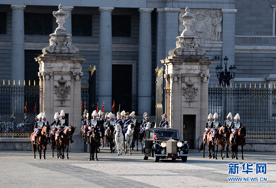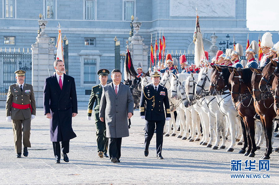 習(xí)近平和夫人彭麗媛乘皇家禮車在身著禮服、騎著高頭大馬的西班牙皇家衛(wèi)隊騎兵護(hù)衛(wèi)下,前往武器廣場。抵達(dá)時,鼓樂齊鳴,費(fèi)利佩六世國王和萊蒂西婭王后上前迎接,互致問候。費(fèi)利佩六世向習(xí)近平介紹王室高級官員。隨后,兩國元首夫婦一同登上檢閱臺。在21響禮炮聲中,軍樂團(tuán)奏中國、西班牙兩國國歌。儀仗隊長趨前請習(xí)近平檢閱。習(xí)近平在費(fèi)利佩六世國王陪同下依次檢閱步兵方隊、騎兵方隊和摩托車隊。習(xí)近平同西方陪同人員握手,費(fèi)利佩六世國王同中方陪同人員握手。兩國元首夫婦返回檢閱臺,觀看分列式。在摩托車隊引領(lǐng)下,整齊的軍樂隊、雄赳赳的步兵方隊、威武的騎兵方隊依次通過檢閱臺。