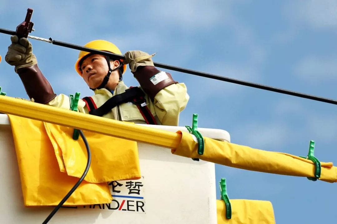 2018-09-06,山東濟(jì)南。一名電力員工專(zhuān)注進(jìn)行線(xiàn)路帶電作業(yè)。作者:CBT