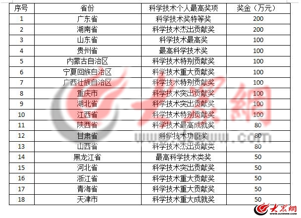海報新聞記者梳理發(fā)現(xiàn),各地科學(xué)技術(shù)獎個人最高獎評選時間多為一年一次,也有個別地方如山西等為兩年一次,每次評選人數(shù)多為1-3人不等。而獎勵金額也各有不同,但是大部分均在50萬到100萬之間,如山東省、湖北省、江西省等。但是也有個別省份,如廣東省和湖南省高達200萬。