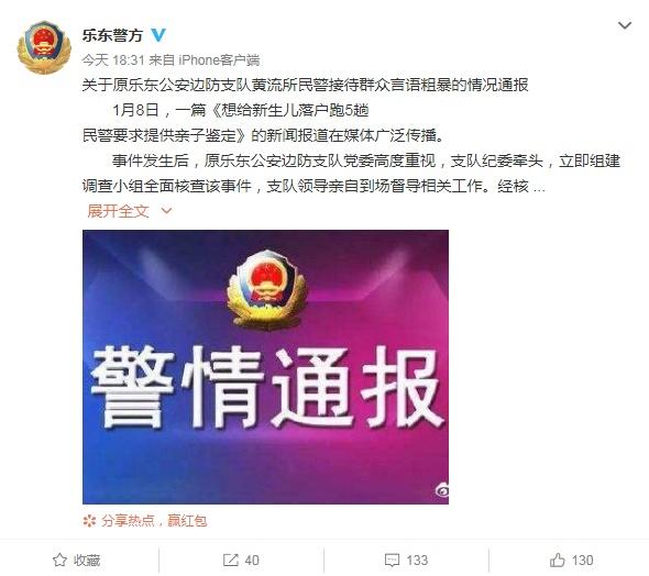 近日,有媒體報(bào)道海南樂東黎族自治縣居民邢先生為了給新生兒落戶,跑了5趟派出所,甚至被民警索要親子鑒定的“折騰”經(jīng)歷,引發(fā)關(guān)注。1月13日,海南樂東黎族自治縣公安局發(fā)布通報(bào)稱,涉事民警未能及時(shí)核實(shí)戶籍辦理材料,導(dǎo)致戶籍辦理時(shí)間較長(zhǎng),且在接待群眾時(shí)出現(xiàn)言語(yǔ)不當(dāng)、行為粗暴的情況。因此,對(duì)涉事民警給予通報(bào)批評(píng)處理,并調(diào)離原工作崗位。