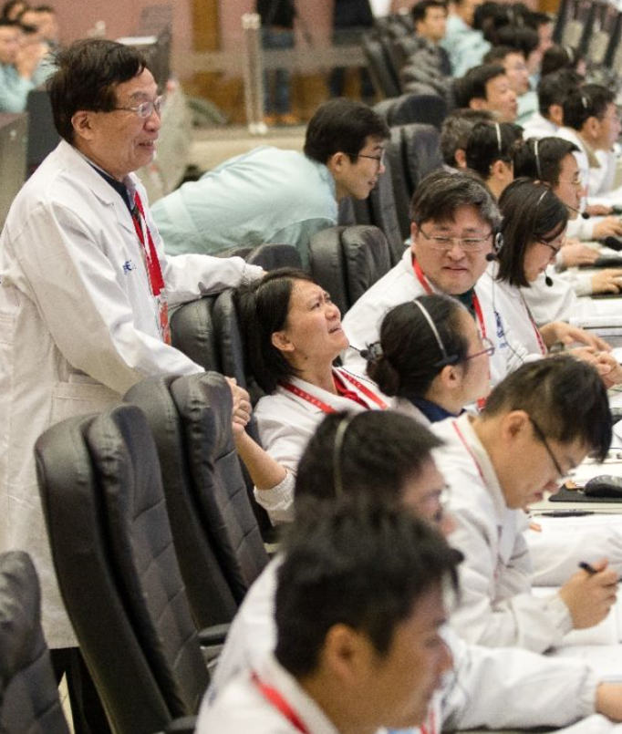 1月3日,嫦娥四號落月的一刻,74歲的中國航天科技集團(tuán)五院深空探測和空間科學(xué)首席科學(xué)家、嫦娥一號衛(wèi)星總設(shè)計師葉培建院士走向正在前排工作席的嫦娥四號探測器項目執(zhí)行總監(jiān)張熇,兩代“嫦娥人”的手,緊緊地握在了一起。新華社記者金立旺攝