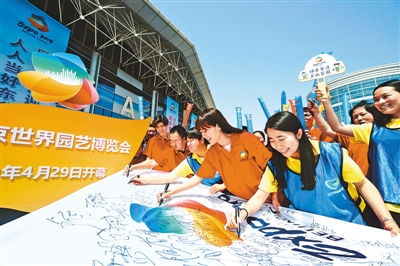 北京延慶區(qū)團委組織志愿者在世園會誓師行動旗幟上簽名(資料照片)。本報記者 賀勇攝