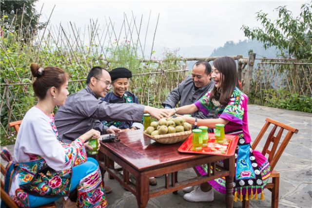 在湖南省湘西土家族苗族自治州花垣縣雙龍鎮(zhèn)十八洞村,村民邀請(qǐng)遠(yuǎn)方的客人品嘗湘西特產(chǎn)獼猴桃和獼猴桃果汁飲料。(新華社記者王天聰攝·2017年)
