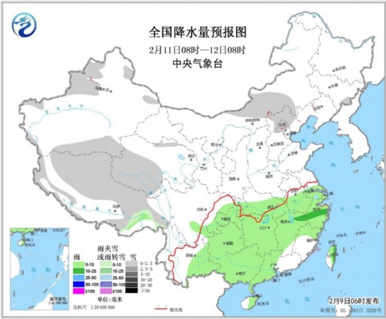 圖3 全國降水量預(yù)報圖(2月10日08時-11日08時)