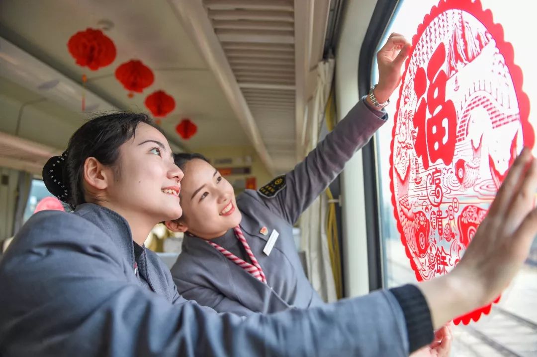 2019-01-29,江西省南昌市。南昌至北京西的Z68次列車上,乘務(wù)員在車上貼上窗花,為旅客準(zhǔn)備免費(fèi)書籍、玩具和春節(jié)物品等,營(yíng)造濃濃的年味兒。作者:清風(fēng)吹過60年