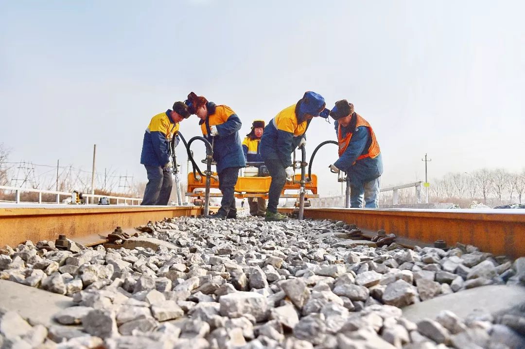 2019-02-06,河北省唐山市。北京局鐵路集團(tuán)公司所轄的七灤線上,工務(wù)工人正在搗固線路,確保春運(yùn)行車安全。作者:養(yǎng)路工