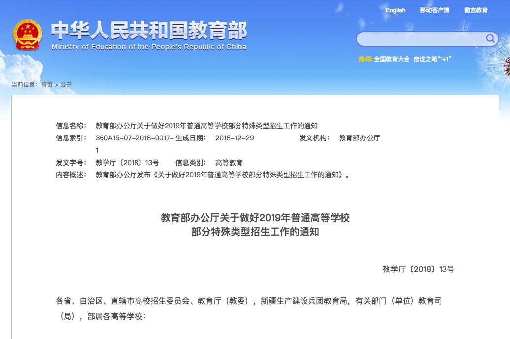 中國青年報注意到,去年12月,教育部下發(fā)《關于做好2019年普通高等學校部分特殊類型招生工作的通知》,發(fā)布2019年普通高等學校部分特殊類型招生基本要求。