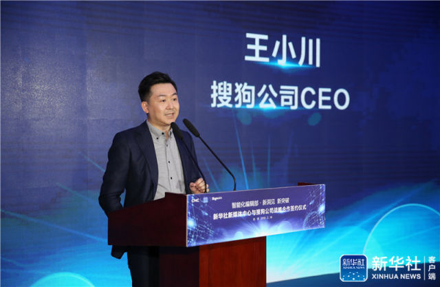 2月19日,新華社聯(lián)合搜狗公司在京發(fā)布全新升級的站立式AI合成主播并推出全球首個AI合成女主播。圖為搜狗公司CEO王小川致辭。新華社記者 肖磊濤 攝