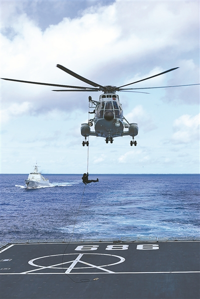 特戰(zhàn)隊員從直升機(jī)上滑降。