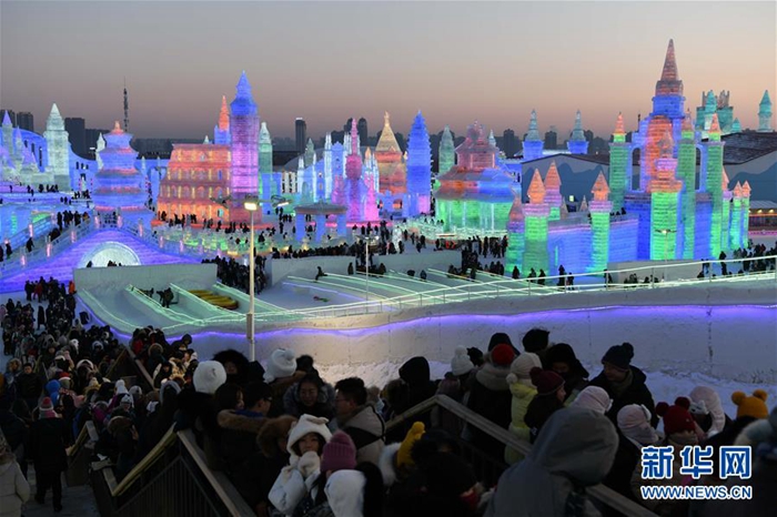 游客在哈爾濱冰雪大世界園區(qū)排隊(duì)體驗(yàn)冰雪娛樂(lè)項(xiàng)目(1月5日攝)。新華社記者 王建威 攝
