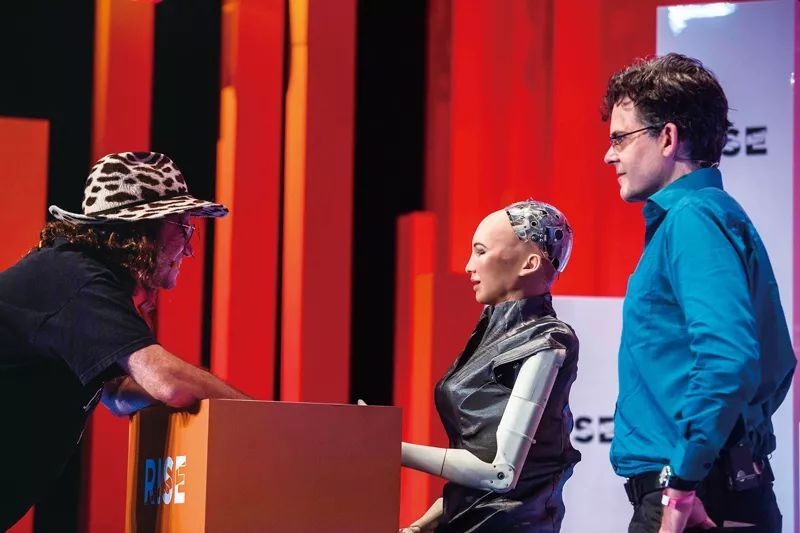 2017年10月,在沙特阿拉伯首都利雅得舉行的“未來(lái)投資倡議”大會(huì)上,機(jī)器人索菲亞被授予沙特公民身份,她也因此成為全球首個(gè)獲得公民身份的機(jī)器人。圖為2018年7月10日,在香港會(huì)展中心,機(jī)器人索菲亞亮相主舞臺(tái)。 ISAAC LAWRENCE/視覺(jué)中國(guó)