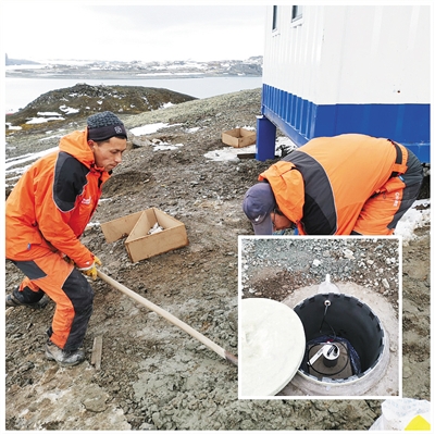 科考隊(duì)員挖掘觀測儀器安放坑。小圖為南極地震臺(tái)站觀測儀器安放坑。
